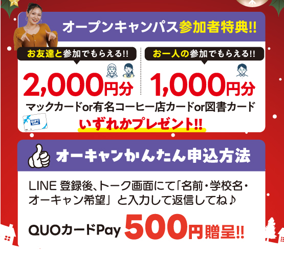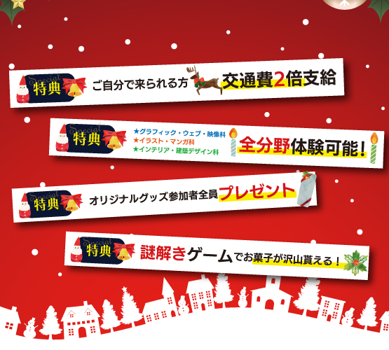 2025.11.14 【高校1・2年生】12/20(土)Xmasオープンキャンパス☆ \スペシャルイベント開催!/ \ 進路活動を始める高校1・2年生対象 / ■12月20日(土)10:00~13:30 ※完全予約制 2025年最後のオープンキャンパスはいつもと一味違う! 全分野のデザイン体験ができちゃう♪ さらに!参加特典盛りだくさん☆彡 特別なオープンキャンパスへお友達を誘って、ぜひご参加ください(^^)/ ★☆★ スペシャルオープンキャンパス特典 ★☆★■高校正門前で待ち合わせする無料送迎もやっています。(交通費補助対象外) 希望者は12/18(木)17:00までに予約してね! 【予約申込】LINEまたは予約フォームから予約してね! ▼LINEから予約する▼ 友達登録後、トークより「①お名前②高校名③クリスマスオーキャン参加」と送信してね!QUOカード500円分プレゼント♪ ▼予約フォームから予約する▼ 下記をクリックして必要事項を入力して送信してね!